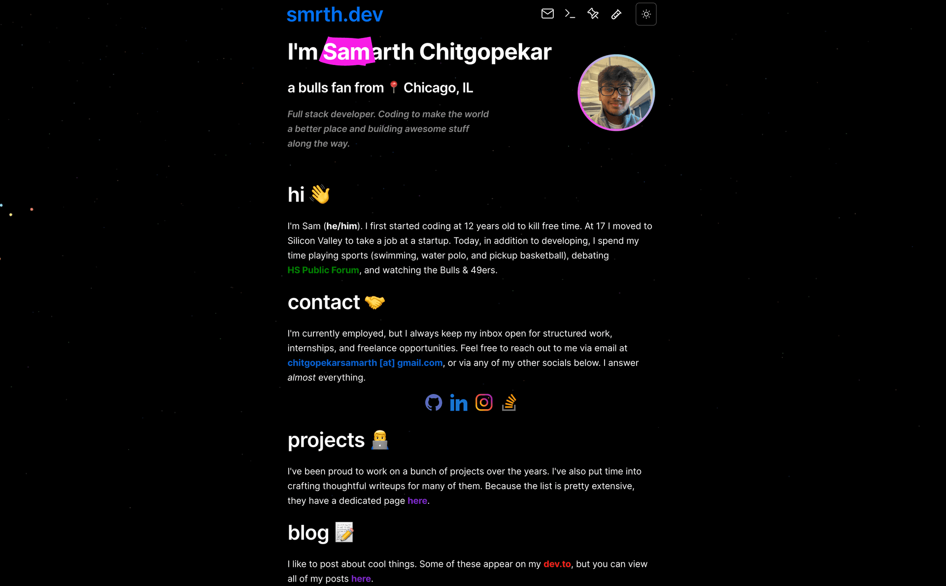 This version of the site was created because I wanted more stability in my serverside framework. I leveraged Next to use UI frameworks (Geist UI) to standardize my design systems and implement SSR easier. Here's what it looked like:
